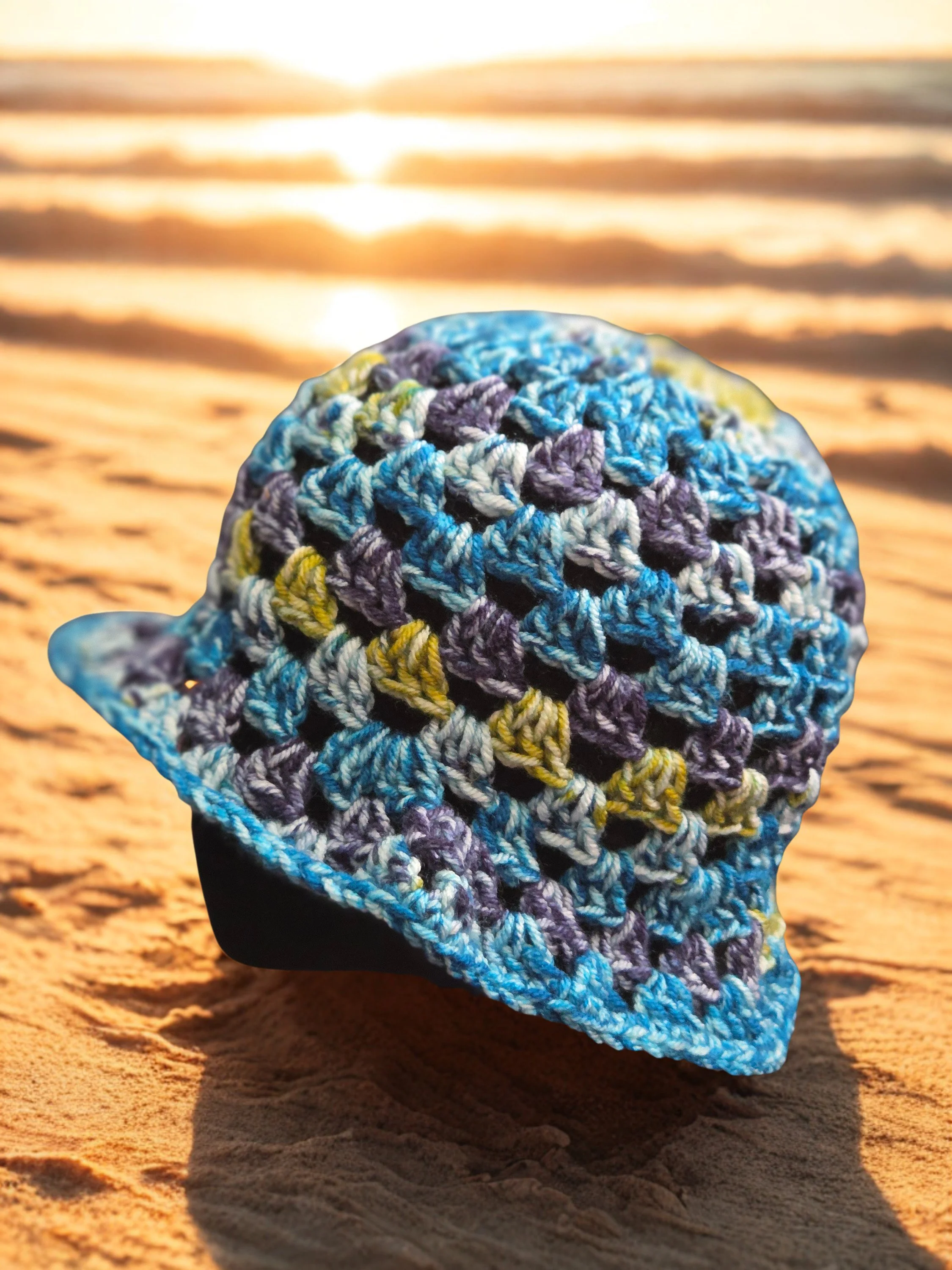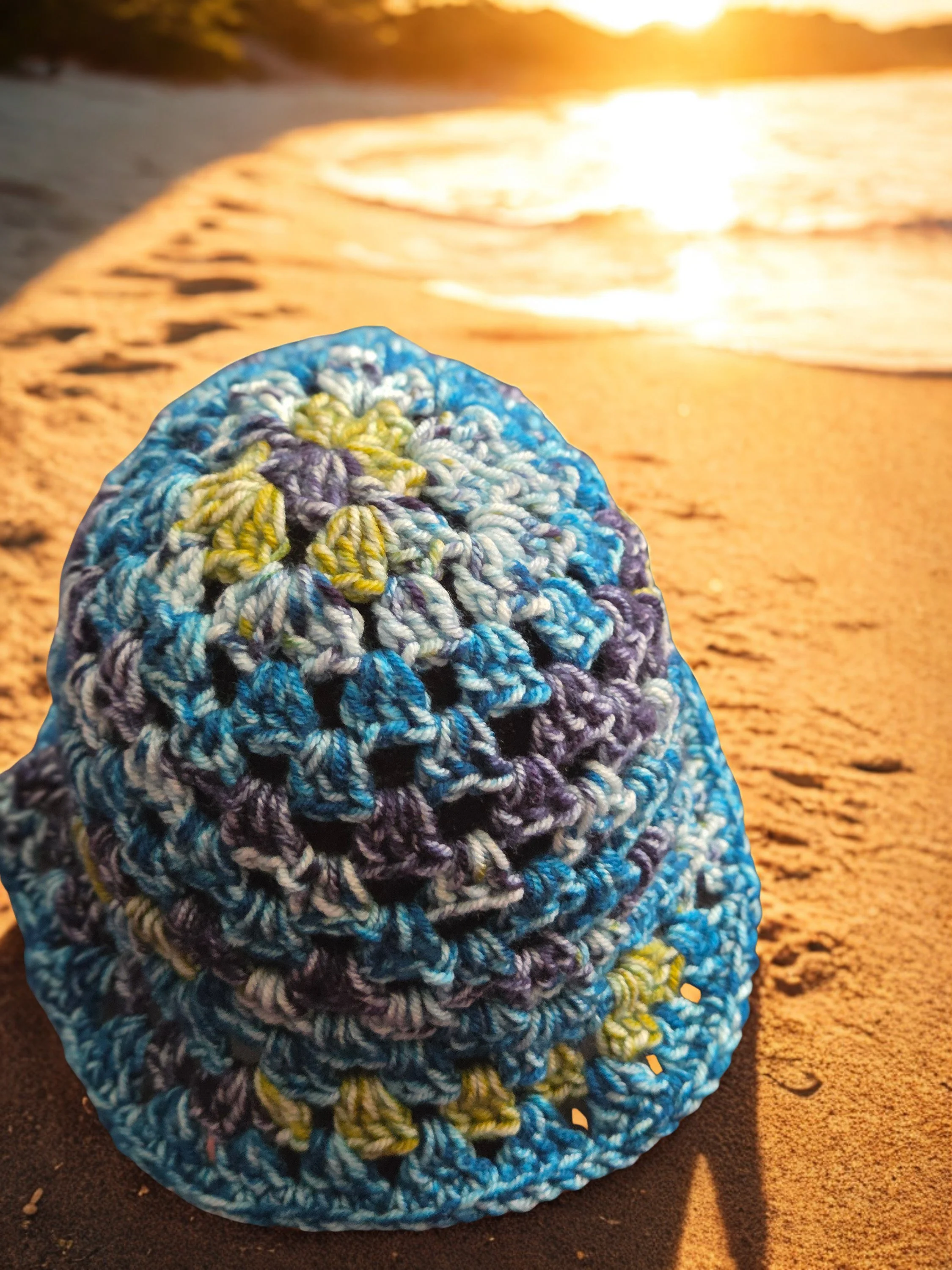 Handmade with soft, lightweight multicolored yarn, this toddler bucket hat is designed for summer adventures. Breathable and comfortable, it keeps little heads shaded while adding a playful splash of color to any outfit. The flexible brim offers sun protection without being stiff, and the soft yarn is gentle on sensitive skin.